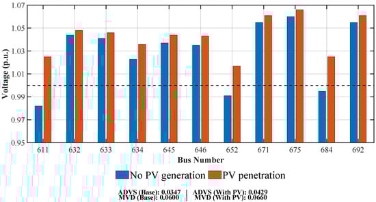 The results show that distributed PV integration in the IEEE 13-node system significantly affects voltage profiles. As shown in Figure 8, PV installation helps mitigate voltage drops in nodes far from the main bus. Conversely, nodes already experiencing overvoltages showed further increases, reaching nearly 1.07 p.u. Similar behavior has been reported in previous studies [29], where PV integration at load buses mitigated voltage drops at the ends of radial feeders while increasing voltage at buses with low local demand or near transformers. Furthermore, Ref. [14] also highlights that a high penetration of photovoltaic systems can have serious implications for the stability and reliability of electrical networks. These findings indicate that, although distributed PV can improve voltage levels in under-voltage nodes, careful siting and sizing are required to avoid overvoltage conditions.