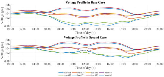 The daily profile for the base and PV injection scenarios is shown in Figure 9, with a peak overvoltage around 9:00–11:00 a.m. and a trough at midday (minimum 0.98 p.u. in the initial case). However, in the second case, it increases significantly in nodes 611, 634, 646, and 675, reaching values of up to 1.07 per unit.