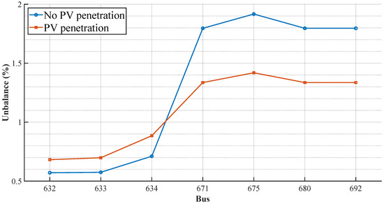 Comparison of the voltage imbalance index across various buses, highlighting the impact of PV penetration.