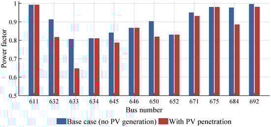 Comparison of the average power factor across selected buses for the base case and with PV penetration, showing that PV integration generally reduces the system PF.