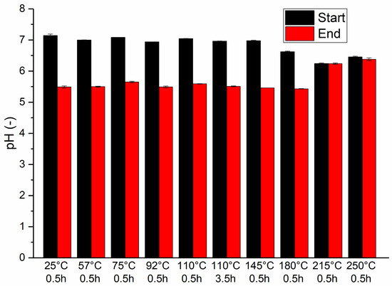 Initially, the pH of most of series (excluding those treated at 180 °C, 215 °C, and 250 °C) was approximately 7, decreasing to around 5.5 by the end of the experiment. For substrates treated at 180 °C, 215 °C, and 250 °C, the initial pH was slightly lower, ranging from 6.24 to 6.62. In the series with substrates treated at 180 °C, the pH decreased to 5.43, whereas in the higher-temperature series, the change in pH was minimal.