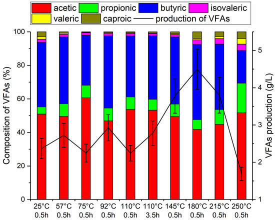 Kakar et al. confirmed that VFA production decreases at temperatures above 200 °C. Their study, which focused on thickened activated sludge, showed that hydrothermal pretreatment at lower temperatures maximizes VFA production, while higher temperatures decrease it. These results confirm the observations from the aforementioned studies [57]. They highlight the importance of optimizing the pretreatment temperature to maximize hydrolysis and minimize the formation of inhibitory substances, thereby improving the process’s overall performance.
