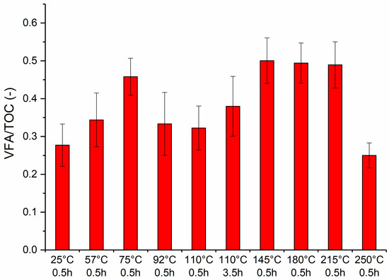In the present study, the ratio of organic carbon converted to VFAs was 0 before the process and remained relatively low afterward (below 0.5, except for a value of 0.501 at 145 °C), as shown in Figure 4. These results suggest that the extent of fermentation was limited, reflecting either an earlier stage of fermentation or a lower overall fermentation activity compared to systems with higher VFA ratios. The low ratio may also indicate altered dynamics of organic matter decomposition, with a slower conversion of carbon into VFAs under the experimental conditions.