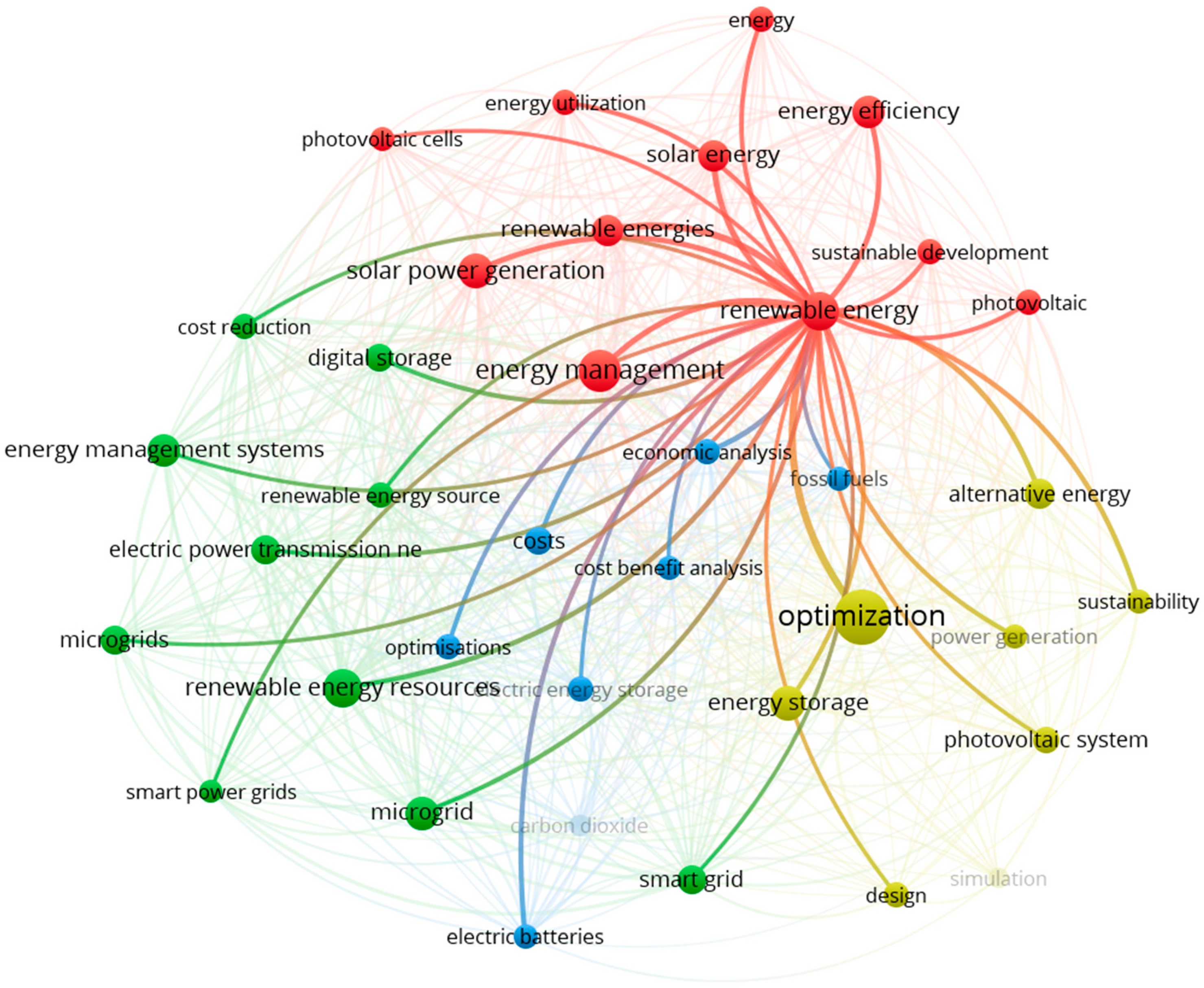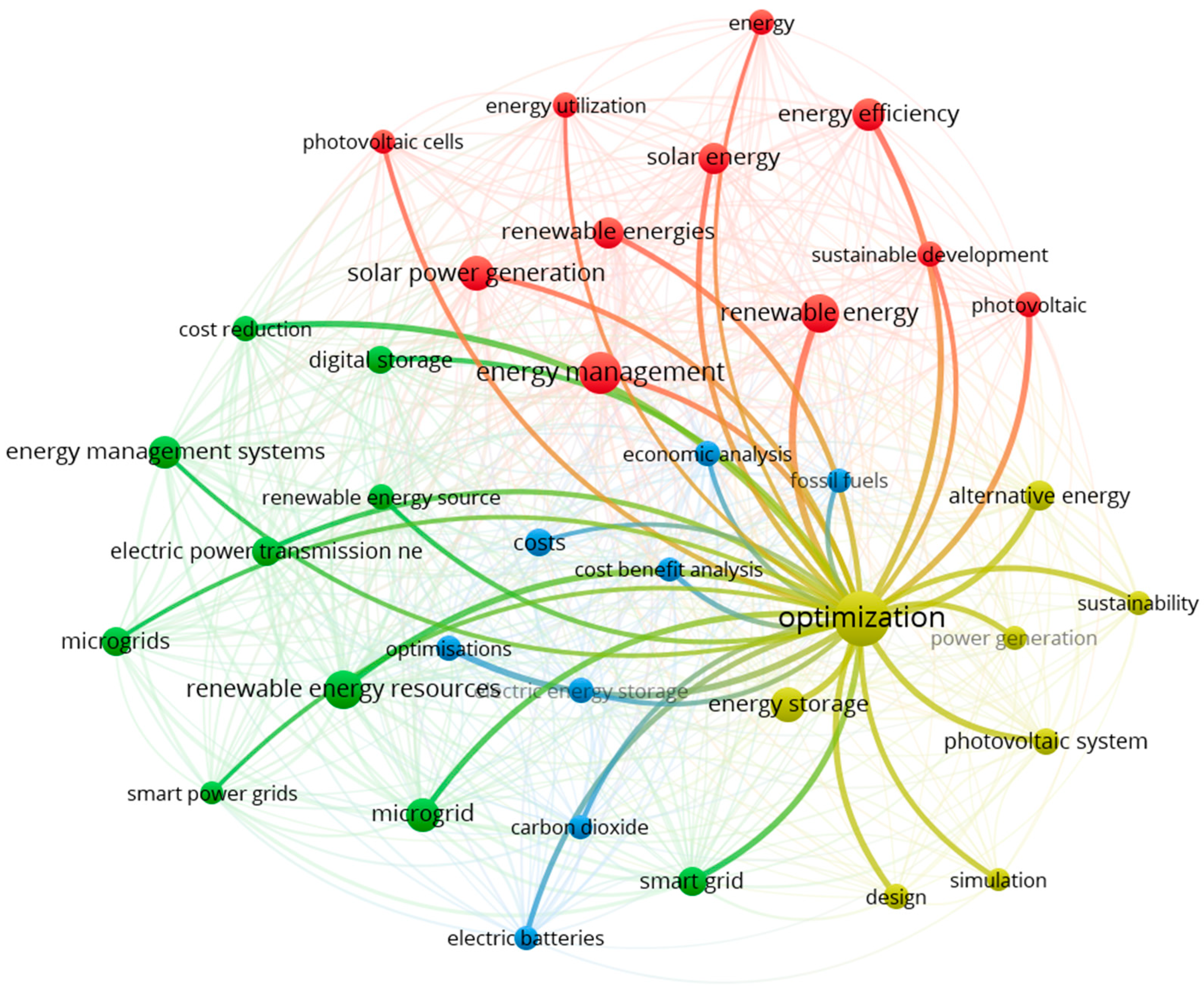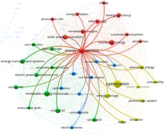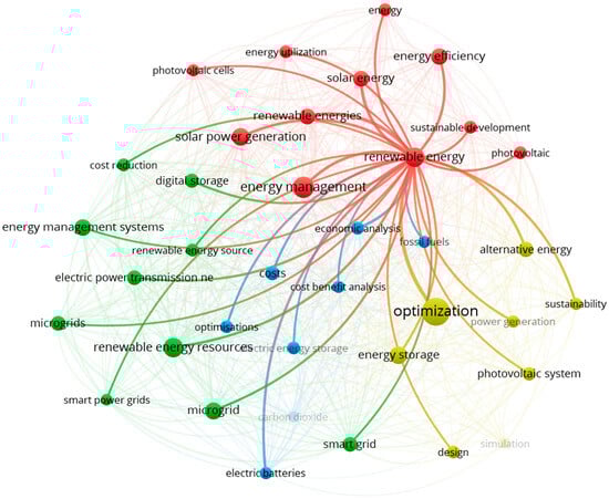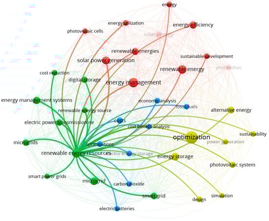 Additional visualizations were generated to highlight the key concepts. Figure 6 illustrates the connections around the term “optimization,” which plays a central role in the yellow cluster and remains one of the most frequently used keywords throughout the analysis. Figure 7 presents the network centered on the term “energy management,” which is the dominant element in the red cluster. Figure 8 illustrates the connections for the term “renewable energy resources,” which is key in the green cluster. Figure 9 illustrates the importance of the term “renewable energy,” which plays a central role in research on the development of renewable energy sources.