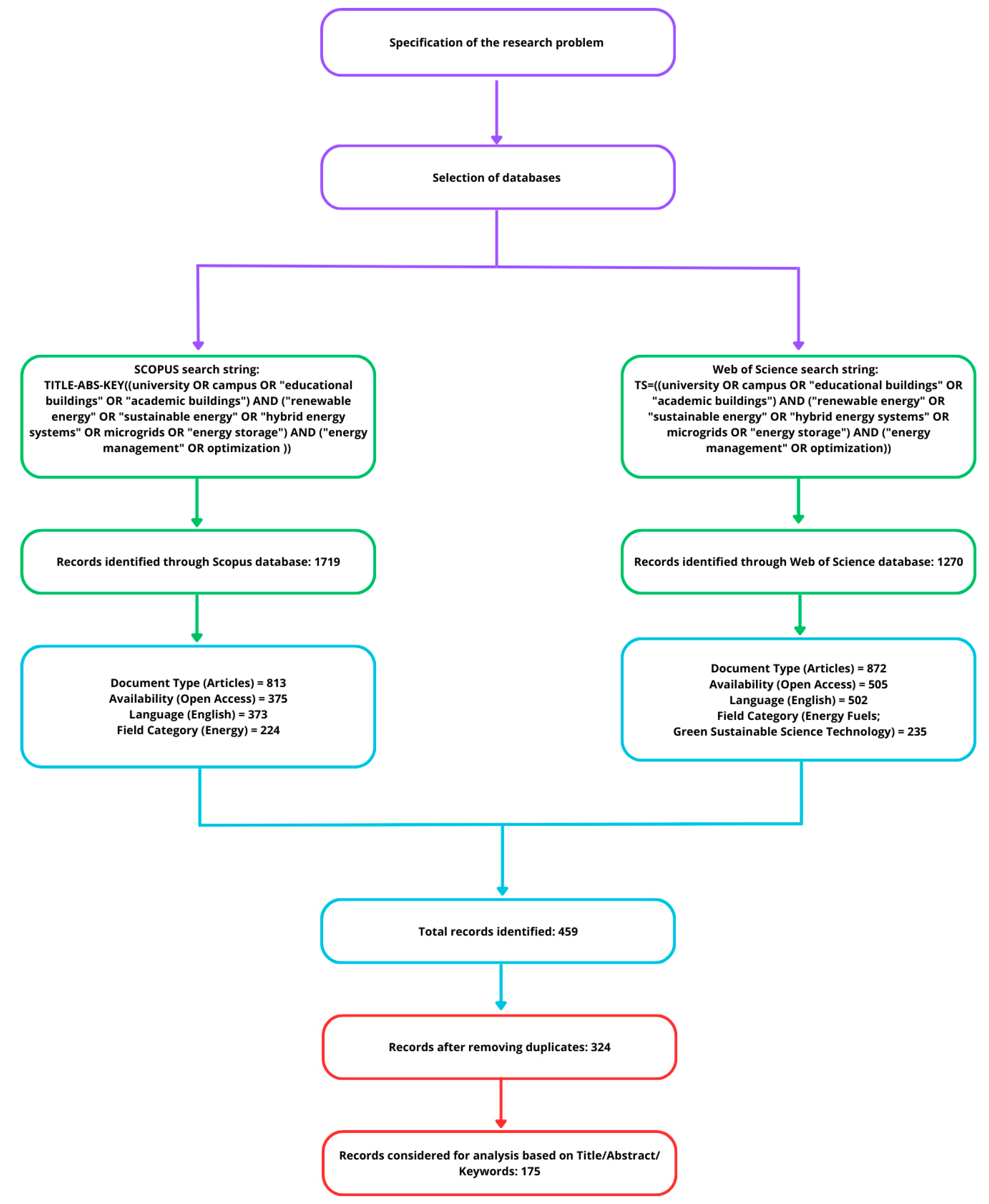 A multi-stage methodology was employed to select literature for bibliometric analysis. After defining the research problem, the databases Scopus and Web of Science, considered the most accurate in the field of engineering, were selected. Keyword definitions were then used, yielding 1719 records in Scopus and 1270 in Web of Science. The results were initially filtered by subject categories, accessibility, language, and document type. Only English-language publications were included to ensure consistency and comparability of results. This language restriction may exclude some relevant non-English studies, which should be considered when interpreting the findings. This process yielded 459 references, which were reduced to 324 after removing duplicates. The final stage involved a thorough analysis of the articles based on content, titles, and abstracts, which led to the selection of 175 articles for research. The individual analysis stages are presented in Figure 1.