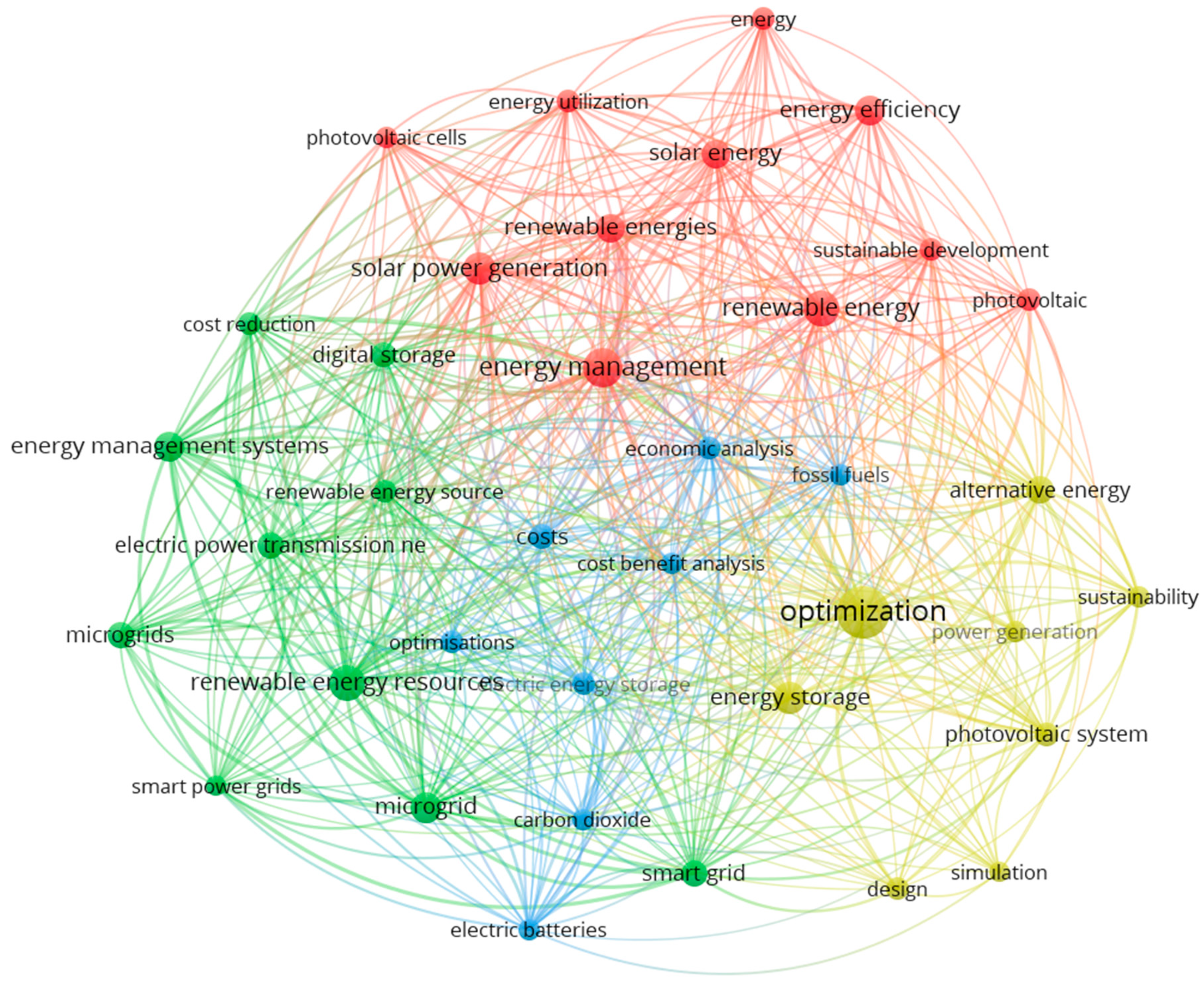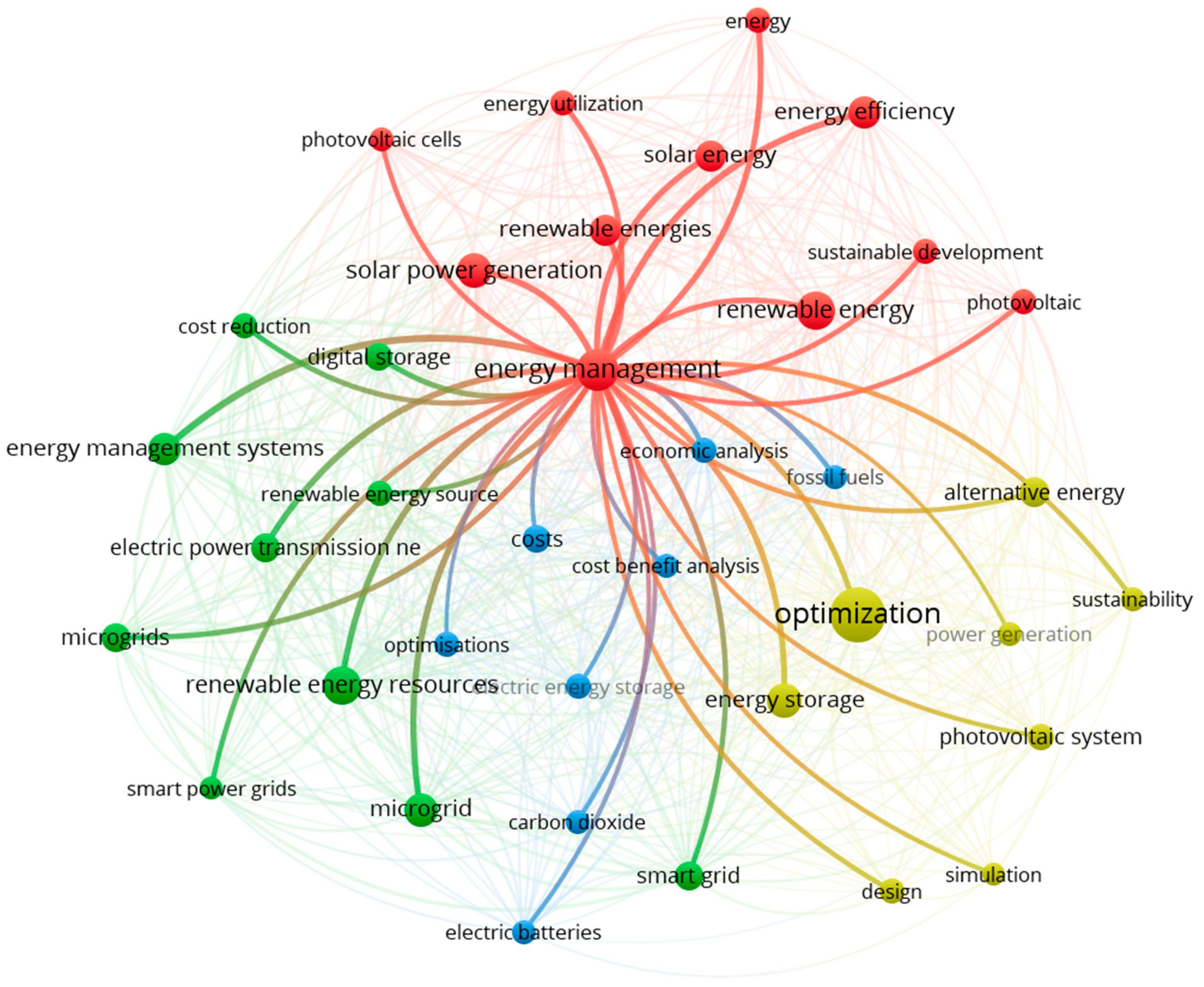 Bibliometric analysis was conducted using data from the Web of Science and Scopus databases using the VOSviewer tool. Both Author Keywords and Keywords Plus were included in the study, allowing for a more comprehensive picture of thematic connections in the literature. Table 4 presents the characteristics of keywords, including their frequency of occurrence, number of connections in the network, relationship strength, and citations. These data allow for the determination of both the popularity of individual terms and their importance in the broader research context. The most frequently occurring keywords were: optimization (66 occurrences, 1942 citations), energy management (38 occurrences, 940 citations), renewable energy (31 occurrences, 541 citations), and renewable energy resources (31 occurrences, 455 citations). These results indicate the dominant role of issues related to energy management, its optimization, and the integration of renewable sources.