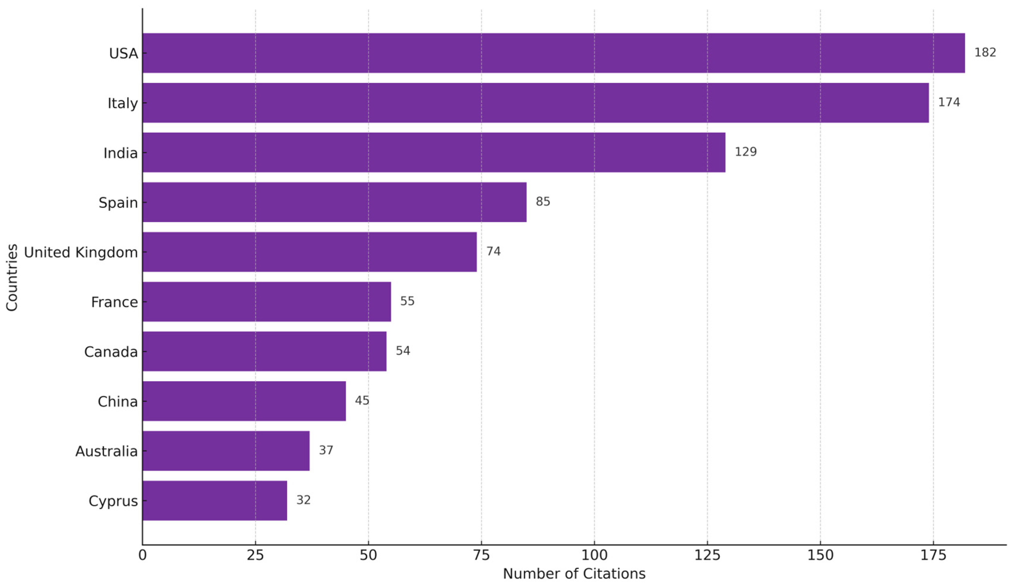 The United States (182), Italy (174), and India (129) recorded the highest citation counts. Their high citation counts demonstrate the significant impact of publications from these countries on the development of global knowledge in the field of renewable energy sources. Spain (85) and the United Kingdom (74) also stand out in terms of recognition within the scientific community, while the share of countries such as France, Canada, and China indicates the varied nature of contributions by region (Figure 10). The lower participation of countries from South America, Africa, and Oceania demonstrates the significant potential for further development of research collaboration in these areas.