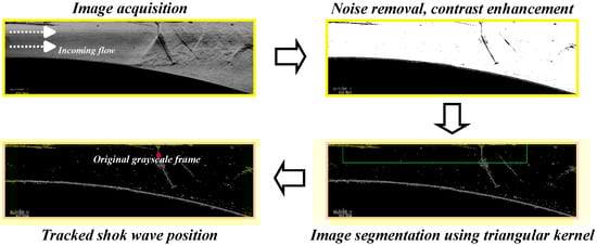 The overall process of carrying out this detection is described in Figure 4, implemented using the image processing toolbox in MATLAB version 2024b. This process is initiated by converting the video into digitized frames captured at an interval of μs, in the form of time-resolved RGB matrices. These RGB images are converted into grayscale images. Shock waves are defined by thin lines of steep pressure or density gradients. The presence of these steep gradients is displayed as a sequence of bright and dark regions [] in Schlieren images, leading to the formation of unequivocal pixel gradient lines within the frames. The implemented code aimed to detect these lines through the usage of an appropriate edge detection technique. However, before applying the required image segmentation, the frames were pre-processed to remove noise and carry out image contrast enhancement. This stage involved convolution of the images with high-frequency filters, leading to enhancement of edges, followed by contrast enhancement to make the shock-wave edges more prominent. The images were further moderately smoothed using a Gaussian filter (standard deviation, ) technique to suppress fine noise pixels within these images. Through these steps, shock-wave edges in the frames were enhanced, leading to an efficient shock-wave detection code.