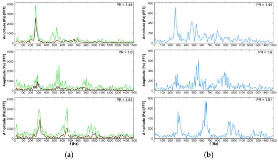 FFT has been a preferred methodology to carry out unsteadiness analysis across several disciplines since 1965 [], including spectral segregation with respect to SBLIs [,]. This method involves deciphering the magnitudes of dominant overtones within the flow unsteadiness by parlaying the time-resolved signal into discrete frequency amplitudes. To that end, this paper made use of FFT to evaluate the square root power spectra of the individual waves embedded in the signal as a function of frequency in the form of frequency spectrum and power-spectral density (PSD) plots. In the first stage, time-resolved pressure data were converted into the respective frequency spectrum plots. Further details regarding the adopted methodology can be gleaned from Ref. []. This process has been repeated for the three PR cases to provide an overview of how the dominant tones shift and vary with different PR values.