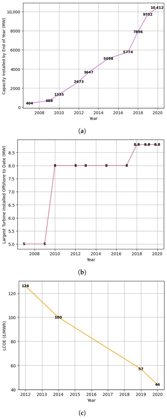 (a) Capacity installed by end of year. (b) Largest turbine installed offshore. (c) Levelised cost of electricity.