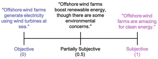 Sentiment analysis (SA), also known as opinion mining, is a field of NLP aiming to analyse opinions, attitudes, and emotions from text. SA is a classification problem, where, for most applications, the sentiment is categorised as either positive (1), neutral (0), or negative (−1)—known as the polarity. In some cases, sentiment can be classified by the degree of subjectivity, which quantifies the amount of factual information contained within the text. The more subjective the text is, the lower the amount of factual information, and the higher the level of personal opinion. These classes include subjective (1), partially subjective (0.5), and objective (0). These classifications are shown in Figure 3 and Figure 4 for polarity and subjectivity, respectively.