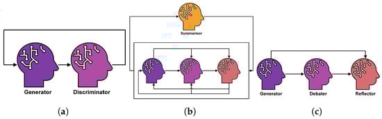 Figure 5. Illustrations of various communication strategies proposed in the MAD literature; including the generator–discriminator framework suggested in [], simultaneous, and one-by-one debate in []. (a) Generator–discriminator. (b) Simultaneous debate. (c) One-by-one debate. - Diverse Roles: Stemming from the parallel between LLMs and social behaviours, having diverse personas for each debater is vital for effective MAD []. Designing for these different roles is a core optimisation challenge in understanding what traits and skills need to be distributed to each debater. In [] approaches for designing these heterogeneous LLM agents based on prior domain knowledge of the types of errors that occur in the sentiment analysis tasks are presented.