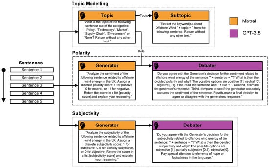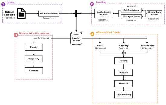 - Second Layer—Labelling: Following data collection and pre-processing, two consistency-based prompting techniques using pre-trained LLMs are compared using a ground truth dataset constructed from a randomly sampled subset of the overall test data. Popular GPT-3.5 and GPT-4 models are used, alongside open-source models Llama, Mixtral and Falcon. Self-consistency and multi-agent debate prompts are designed and contrasted. These consistency-based techniques are essential for reducing hallucinations to improve the reliability of results. The best-performing approach will be selected for labelling the offshore wind dataset, required for performing sentiment analysis. Polarity, subjectivity, category and aspect opinions are chosen to be extracted from the data in order to capture the fine-grained details of offshore wind features. Hence, this implements an aspect-based sentiment analysis task. Best performing refers to the design that yields the most accurate results against the ground truth dataset and that requires the lowest computational cost since energy-efficient models are needed for the future of LLMs.