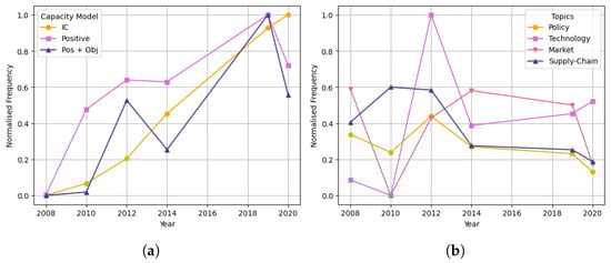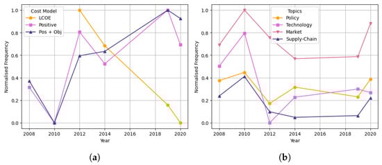This allows for comparison with real offshore wind data of the levelised cost of electricity, installed capacity, and turbine size installation, to understand whether the model accurately forecasts these trends from the given literature, and what type of sentiment measurement predicts this the most. For each feature, the real data are compared against the normalised positive and objective frequency in that year. This will indicate whether the model captures the opinions from scientific professionals of each feature, and whether these positive opinions correctly reflect the trends themselves. Further to this, the evolution of policy, technology, market and supply-chain sectors will be visualised for each feature—to gain greater insight into the influence of each driver on offshore wind development.