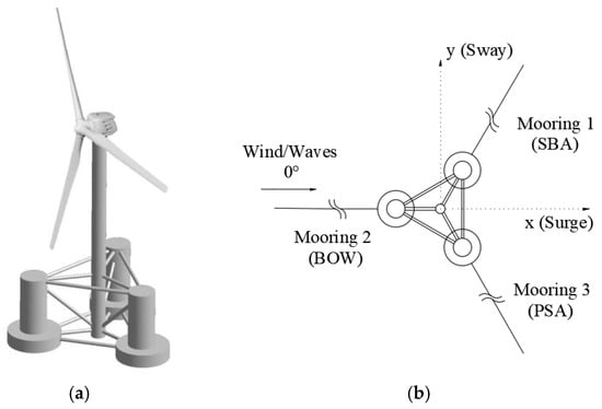 The coupled numerical simulation in this study is conducted by integrating FAST v8.0 and OrcaFlex 10.3 through the use of a dynamic link library (DLL). OrcaFlex is a commercial hydrodynamic software that specializes in the dynamic analysis of floaters and mooring systems, which have been extensively validated []. FAST is an open-source aero-hydro-servo-elastic wind turbine simulation software, utilized for calculating the dynamic responses of horizontal-axis wind turbines.