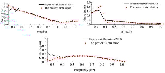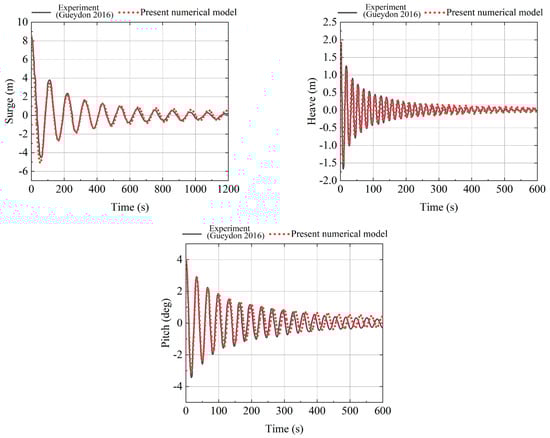The authors’ previous work demonstrates a good agreement between model tests [] and numerical simulations for the free decay characteristics in surge, heave, and pitch, as seen in Figure 3 and Table 2. This indicates that the natural vibration periods and damping characteristics of the tests and simulations correspond well.