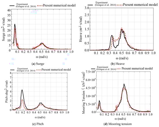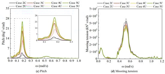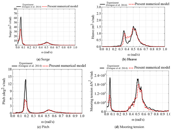 Response spectra of surge, heave, pitch, and mooring tension in Case R2 [] (adapted from []).