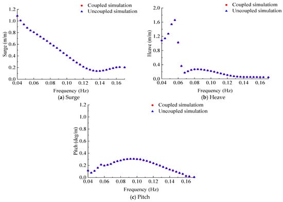 Figure 7 and Figure 8 present the motion RAOs and dynamic response results of the FOWT with the fully coupled numerical method and decoupled numerical method, respectively. Table 6 shows the time-domain statistical results for different coupled models, and the Case R1C and Case R1U represent the fully coupled numerical model and the decoupled numerical model under the Case R1 environment condition, respectively. From this, it can be observed that the response results of both the fully coupled and decoupled numerical models are basically consistent under the wave-only condition. This is because the calculation of wave loads and motion responses in both the fully coupled and decoupled numerical models is based on the same theoretical method, as well as the hydrodynamic model being consistent. Furthermore, comparing Table 5 and Table 6, it is shown that the experimental results of motion response and mooring tension are consistently larger than the predictions from the coupled numerical model. Meanwhile, the decoupled model, which is computationally cheaper and generally considered less accurate, produces results that are also larger than the coupled model under combined irregular waves and wind conditions. This indicates that the decoupled model’s predictions are actually closer to the experimental data than the fully coupled model in some specific conditions.