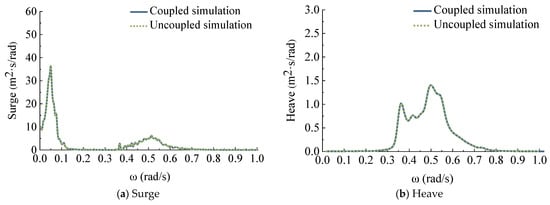 Figure 9 indicates that within the low-frequency range, the surge response peak of the decoupled numerical model is slightly smaller than that of the fully coupled numerical model, whereas the pitch response peak is significantly reduced. Compared to the surge response, the impact of the two modeling methods on the pitch response is more obvious. The turbulence intensity has less effect on the motion response within the wave frequency range, mainly affecting the response results within the low-frequency range. As the turbulence intensity increases, the peak value of the surge and pitch low-frequency response also rises. This indicates that the wind load mainly affects the low-frequency motion response of the FOWT. Additionally, Figure 9 shows that the surge and pitch response peaks under the turbulent wind at the natural frequency are much greater than those under steady wind, and the difference in pitch response results between the fully coupled model and decoupled model is more pronounced. From Figure 9d, it is known that turbulence intensity also affects the mooring tension response within the wave frequency range, with greater turbulence intensity resulting in a smaller response peak. In addition, different coupled analysis methods and turbulence intensities have a very small impact on heave.