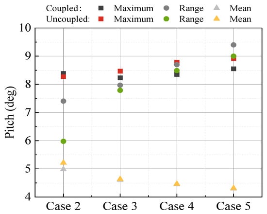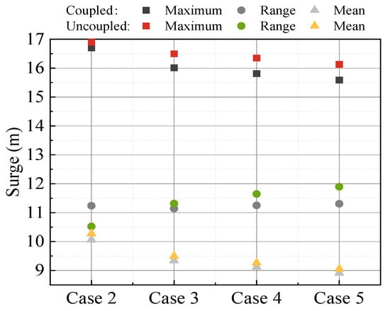 Figure 10, Figure 11 and Figure 12 show the response result statistical graphs of surge, pitch, and mooring tension with different turbulence intensities. With steady wind and turbulence intensities of 0.12, 0.16, 0.20, the surge maximum of the decoupled numerical model is 1.18%, 3.01%, 3.42%, and 3.47% larger than those of the fully coupled numerical model, respectively. Evidently, the surge maximum of the decoupled numerical model is larger than that of the fully coupled numerical model, and the surge response difference increases with the increase in turbulence intensity. Additionally, both the surge maximum and mean values decrease with the increase in turbulence intensity. This is because, under the full-load wind speed condition, the wind load will decrease if the wind speed is greater or less than the rated speed, and the greater the turbulence intensity, the higher the probability that the wind speed will deviate from the rated wind speed over time. The wind load under steady wind excitation is larger than that under turbulent wind excitation. In addition, when the aerodynamic excitation is coupled with hydrodynamic loads, it results in reduced environmental load extreme values and a smaller surge maximum. As illustrated in Figure 11, the range of surge variation expands with the increase in turbulence intensity.