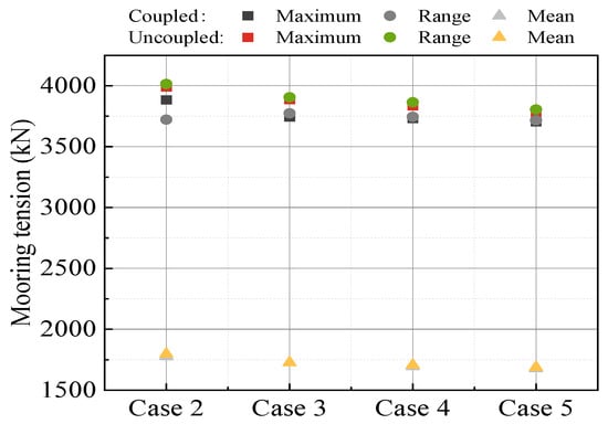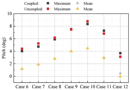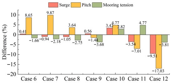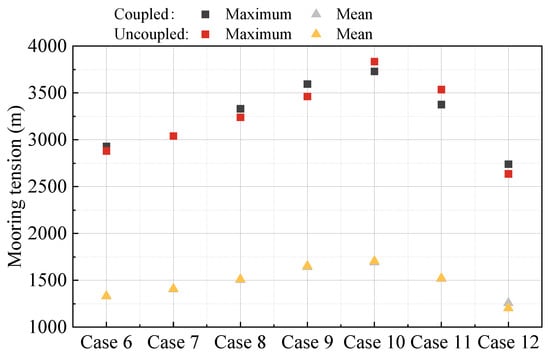 This section also conducts a comparative study on the motion and mooring tension responses of the two coupled modeling methods under different wind speeds. The wave conditions are presented in Table 7, and the wind condition is modeled with a turbulence intensity of 0.16. There are 7 conditions, ranging from Case 6 to Case 12, which correspond to wind speeds of 4.5 m/s, 6.2 m/s, 8 m/s, 9.7 m/s, 11.4 m/s, 16 m/s, and 33.6 m/s. The maximum and mean values in the time domain of surge, pitch, and mooring tension are shown in Figure 14, Figure 15 and Figure 16, respectively. It can be seen that under different wind speeds, the difference in pitch response is greater than that in surge response between the fully coupled model and the decoupled model. In addition, the difference in statistical values of mooring tension of the fully coupled model and decoupled model under different wind speeds is not significant, and the maximum difference between the two models occurs in Case 11, which is 4.77% (Figure 17). Therefore, during the preliminary analysis and optimization design phase of the mooring system of the FOWT, the decoupled numerical simulation method can be adopted to improve computational efficiency, and the response results of mooring tension are slightly different from those of the fully coupled numerical simulation method.