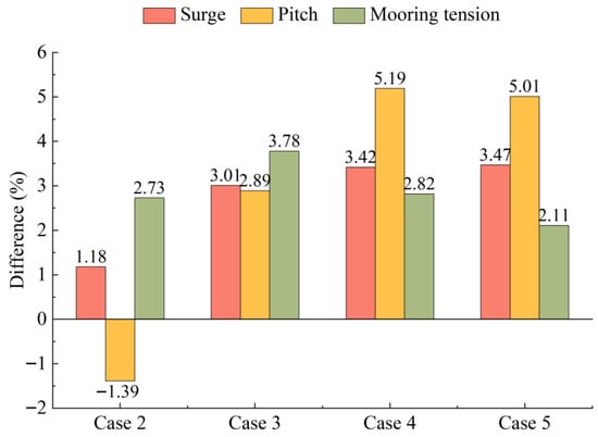 Percentage differences between fully coupled and decoupled numerical models (the maximum values of surge, pitch, and mooring tension).