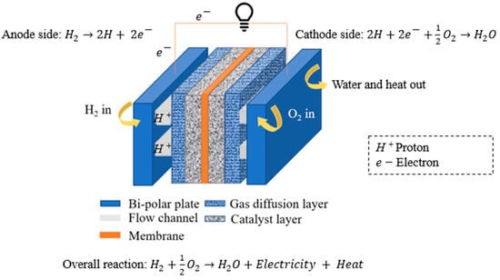 Figure 1 illustrates the basic principles of PEMFC operation with their corresponding reactions. In addition to these reactions, heat is also generated due to the ohmic resistance of the membrane and the condensation of water vapor [13,14]. Nearly 50% of the total energy produced is converted to heat, which can be expressed as follows [15]: