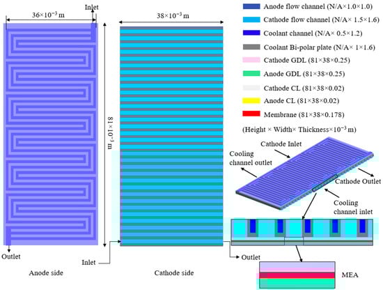 Flow-field geometries and component dimensions used in simulations: serpentine anode side channels, straight cathode channels, and membrane electrode assembly (MEA) layering.