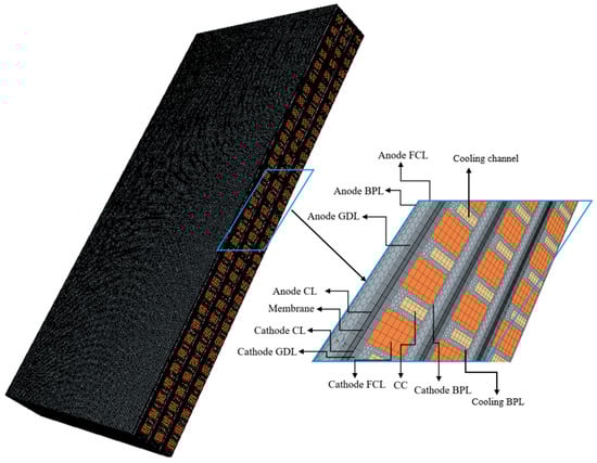 Building on the simulation work conducted in previous studies [53,54], the PEMFC stack in this study consists of 3 cells connected in series. The anode and cathode sides are designed with distinct flow channel configurations: a 3-channel serpentine pattern on the anode and 32 straight channels on the cathode side. Figure 2 provides a schematic representation of the PEMFC components, along with their respective dimensions. The membrane electrode assembly (MEA) comprises a gas diffusion layer (GDL) and catalyst layer (CL) on both sides of a single central membrane. Figure 3 illustrates the computational domain for the PEMFC stack. A structured and directed mesh (polygonal mesh) was generated for flow channel (FCL), CL, GDL, and membrane, ensuring high accuracy in the simulation. For the bipolar plate (BPL), an automated mesh (polyhedral mesh) was selected based on the results of a grid convergence index (GCI) calculation, which will be discussed in detail in a subsequent section.