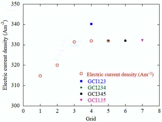 Area-averaged electric current density and GCI versus grid levels demonstrating mesh convergence.