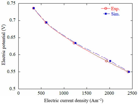Polarization curve of the simulated no-coolant case compared with experimental data [53].