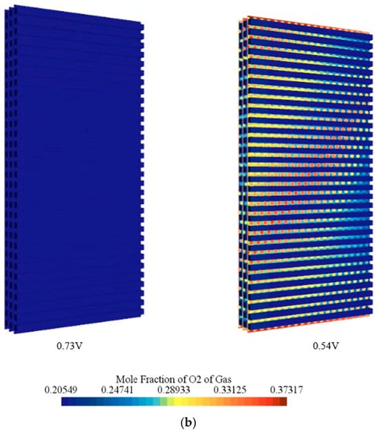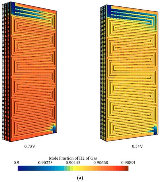 The voltage was applied to the cathode current collector, and the reaction distributions were analyzed for the corresponding voltage. To understand the mole fraction distribution on the anode side at different voltages, two extreme cases, i.e., 0.73 V and 0.54 V, are shown in Figure 6. In Figure 6a, the hydrogen distribution on the anode side of the PEMFC is shown at two different voltages. At 0.73 V, the mole fraction of hydrogen remains high and relatively uniform throughout the serpentine flow channels, with only slight depletion visible near the outlet. This uniformity indicates that hydrogen consumption is limited under low current density, as the reaction rate is relatively slow at higher voltages. In contrast, at 0.54 V, corresponding to high current density, hydrogen is consumed more rapidly along the channel length, leading to significant gradients and visible depletion near the outlet region. This highlights the risk of localized fuel starvation under heavy load conditions. In Figure 6b, the oxygen distribution on the cathode side is presented. At 0.73 V, oxygen mole fraction remains nearly constant and close to inlet conditions, showing that oxygen utilization is minimal when the current density is low. However, at 0.54 V, strong gradients develop across the cathode channels, with clear depletion in active reaction zones. This uneven distribution indicates oxygen starvation, which is a well-known limiting factor for PEMFC performance at high current density.