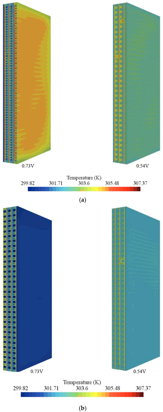 In Figure 7b, the anode side temperature distribution follows a similar trend. At 0.73 V, the structure remains cooler and more uniform, while at 0.54 V, localized hot regions develop along the channels, especially in the absence of active coolant flow. This indicates that as the load increases, the heat generated within the cell accumulates and elevates local temperatures, leading to uneven distribution.