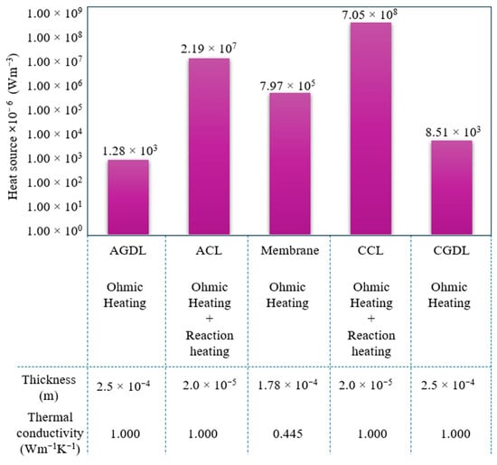 The bottom table contextualizes these results with structural parameters. The ACL and CCL are very thin (2.0 ×10−5 m each), yet they dominate heat generation, particularly the CCL, due to their central role in electrochemical reactions. By contrast, the GDLs are thicker (2.50 ×10−4 m) but contribute negligibly to overall heating. The membrane, with intermediate thickness (1.78 × 10−4 m) and low thermal conductivity, contributes moderately through ionic ohmic heating but also acts as a thermal bottleneck. In summary, this figure emphasizes that the catalyst layers, especially the cathode catalyst layers, are the primary sources of heat in PEMFCs, driven by both ohmic and reaction heating.
