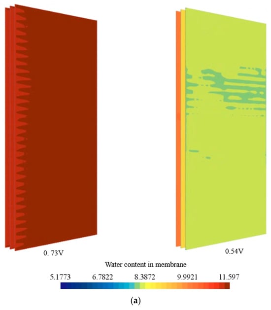 Three-dimensional view in (a) the membrane water content at two operating voltages of and (b) the electrochemical reaction rate at the interface between the membrane and the cathode catalyst layer for 0.73 V and 0.54 V from the left.