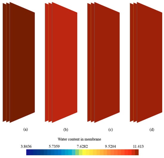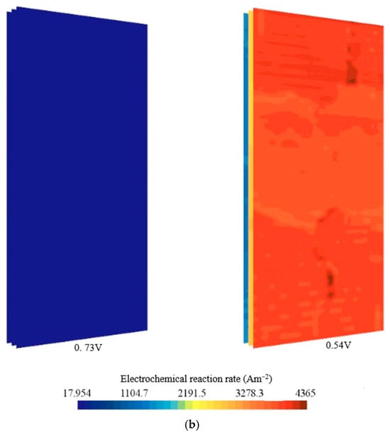 In Figure 9, the water content of the membrane and electrochemical reaction rate at CCL interphase are investigated at high and low voltages. At 0.73 V, corresponding to low current density, the membrane shows higher and more uniformly distributed water content, as electro-osmotic drag and back-diffusion are balanced under modest reaction conditions. This is consistent with the relatively low electrochemical reaction rate shown in Figure 9b, where oxygen reduction proceeds slowly, generating limited additional water on membrane. At 0.54 V, however, the higher current density drives a significant increase in the electrochemical reaction rate (Figure 9b), resulting in non-uniform spatial activity. Despite stronger oxygen reduction kinetics, the water content in the membrane (Figure 8) decreases under this condition due to greater electro-osmotic drag pulling water toward the cathode and possible local drying near the anode side. When combined with earlier observations of reactant depletion (Figure 6) and heat accumulation (Figure 7), these results highlight how low-voltage, high-current operation enhances power output but simultaneously aggravates issues such as uneven hydration, local drying, and thermal stress [60]. In contrast, high-voltage operation ensures better membrane hydration and stability, albeit at reduced power density.