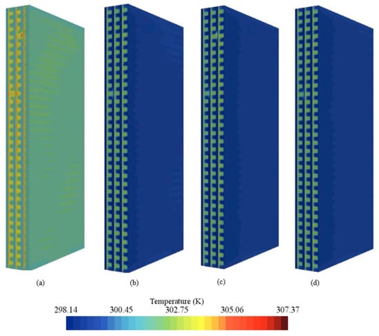 Temperature fields at 0.54 V for four configurations: (a) without coolant, (b) with water, (c) with CuO nano fluid, and (d) with Al2O3 nanofluid.