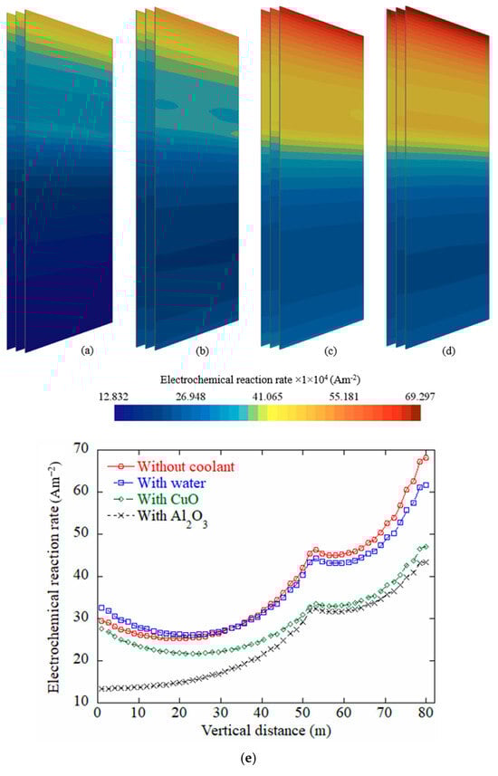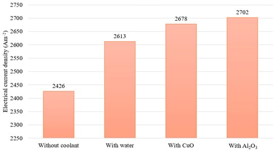 Figure 11 compares the electrical current density of the PEMFC at low voltage (0.54 V) under different cooling conditions. Without coolant, the current density remains the lowest at 2426 A m−2 due to excessive heat buildup and non-uniform temperature distribution, which impair membrane hydration and reaction kinetics.