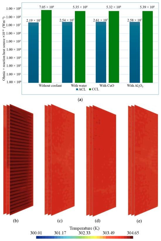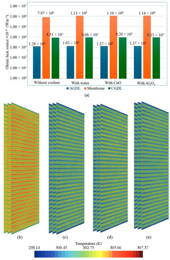 The proton-exchange membrane fuel cell (PEMFC) generates a significant reaction and ohmic heat during operation, imposing stringent cooling requirements. This study employs a three-dimensional, non-isothermal, steady multiphase multiphysics model to investigate heat generation and transport in a three-cell PEMFC stack using deionized water, CuO, and Al2O3 nanofluids (1 vol%) as coolants. The base (no-coolant) configuration was validated against a published polarization curve for a nine-cell stack. Introducing coolant channels increased the area-averaged current density from 2426 A m−2 (no coolant) to 2613 A m−2 (water), 2678 A m−2 (CuO), and 2702 A m−2 (Al2O3), representing up to an 11.4% performance improvement while reducing the peak cell temperature by approximately 7–8 °C. Among the examined coolants, Al2O3 nanofluid achieved the lowest maximum temperature and a favorable pressure drop, whereas water maintained the most uniform temperature field. A price-performance factor (PPF) was introduced to evaluate the techno-economic trade-off between cost and cooling benefit. This study highlights that, despite scale-related limitations between three-cell simulations and nine-cell experiments, nanofluid coolants offer a practical route toward thermally stable and high-performance PEMFC operation.