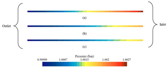 On the anode side, the Anode Gas Diffusion Layer (AGDL) exhibits minimal heat generation (1.28 × 103 W/m3), attributed solely to ohmic heating, as no electrochemical reactions occur within this porous medium. The Anode Catalyst Layer (ACL) shows significantly higher heat generation (2.19 × 1013 Wm−3), due to the combination of ohmic resistance and reaction heat from the hydrogen oxidation reaction (HOR). The membrane produces moderate heat (7.97 × 1011 Wm−3), arising purely from ionic ohmic losses, as protons migrate through its relatively low thermal conductivity (0.445 Wm−1K−1) compared to other layers. On the cathode side, the Cathode Catalyst Layer (CCL) exhibits the highest heat generation of all layers (7.05 × 108 W/m3), due to a combination of substantial ohmic heating and exothermic reaction heating from the oxygen reduction reaction (ORR), which is more sluggish and energy intensive than the HOR. Finally, the Cathode Gas Diffusion Layer (CGDL) produces very little heat (8.51 × 109 Wm−3), again limited to ohmic heating.