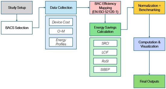 15]. To prevent overestimation, each BAC upgrade factor is applied only once per domain. In cases where devices influence multiple services, interactions were modeled conservatively, and potential overlaps were acknowledged as a limitation in the results. The energy savings derived from Equations (1) and (2) serve as the basis for calculating performance indicators such as CSESP and SSEC.
