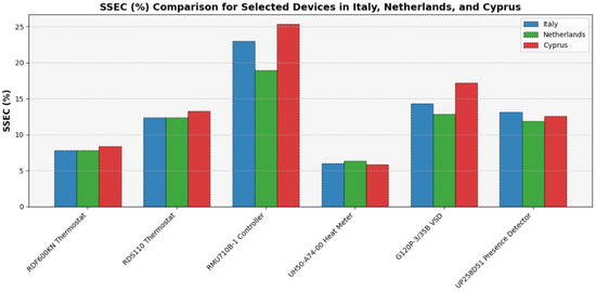 Figure 5 shows the Seasonal Smart Efficiency Coefficient (SSEC), which separates savings for six of the eleven devices that are directly associated with seasonal loads, such as heating and cooling. Cyprus recorded the highest SSEC values for five of the six devices, reflecting low baseline automation levels combined with large seasonal cooling demand. For most devices, however, national differences remained within ±2%, suggesting broadly similar proportional energy use across seasonal loads. The biggest difference is in the RMU710 B-1 Universal Controller, where Cyprus is ahead of The Netherlands by 6%. The structural reality that heating and cooling loads account for 65–70% of total energy demand in all three nations is reflected in these narrow margins, which causes the relative seasonal efficiency potential to converge. The relatively high SSEC value of the RMU710 B-1 Universal Controller in Cyprus can be explained by its advanced multi-domain control functions, which interact strongly with the baseline of low automation levels in the Cypriot market. This device’s adaptability to both cooling and heating modes amplifies seasonal efficiency gains where automation penetration is limited. Such device-specific characteristics explain why results are not solely a reflection of climatic variation.