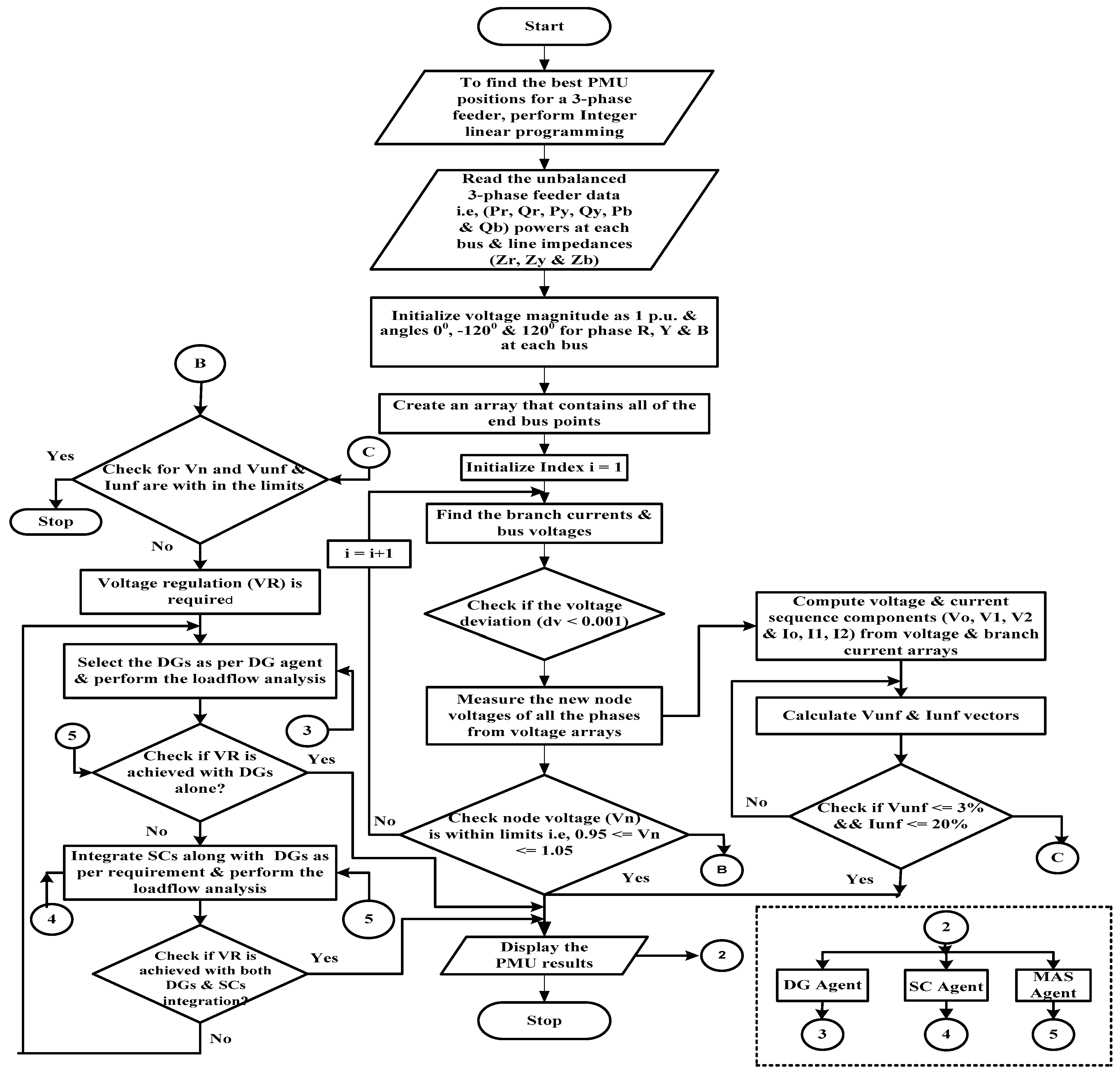 When viewed in the context of earlier studies, the need for a distinct approach becomes clear. While several methods have been proposed for voltage regulation in distribution networks, most are developed for balanced systems, rely on centralized control, or consider the operation of a single type of device, such as DG units, shunt capacitors, or OLTCs in isolation. In contrast, the present work adopts a coordinated MAS framework that integrates optimal PMU placement for cost-effective real-time monitoring and complete system observability. The method simultaneously coordinates DGs and SCs through voltage-sensitivity and loss-sensitivity analysis, with specific emphasis on unbalanced three-phase radial distribution networks. The proposed approach is flexible and scalable, making it applicable to any radial feeder irrespective of feeder length, lateral complexity, or variations in the X/R ratio. This combination of MAS-based coordination, PMU-assisted monitoring, and joint DG–SC operation in unbalanced networks has not been reported in earlier literature and constitutes the key distinguishing feature of this study.