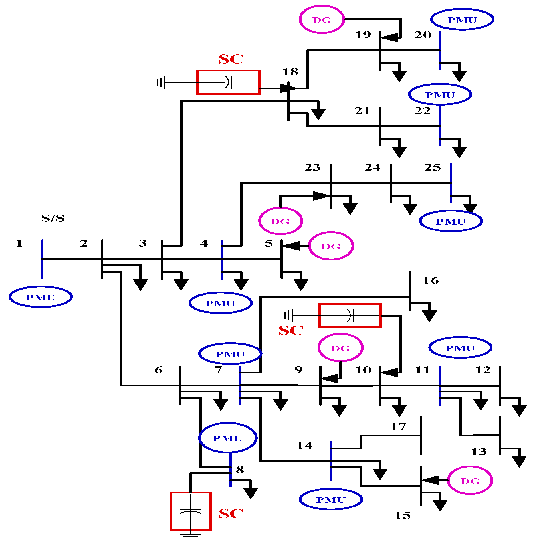 Figure 7 shows the voltage profile of 25-bus unbalanced 3-phase radial feeder networks without DG/SC using a PMU setup.