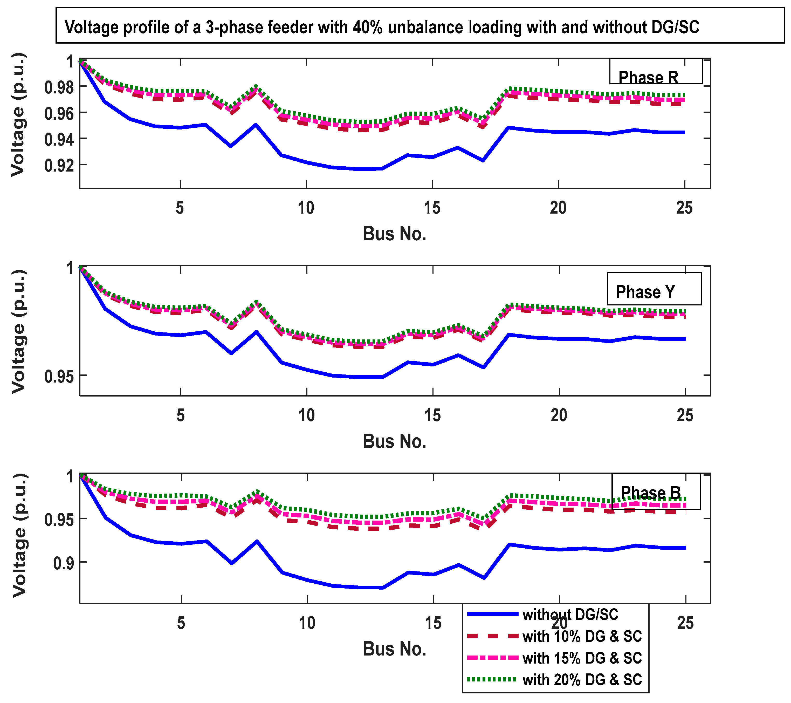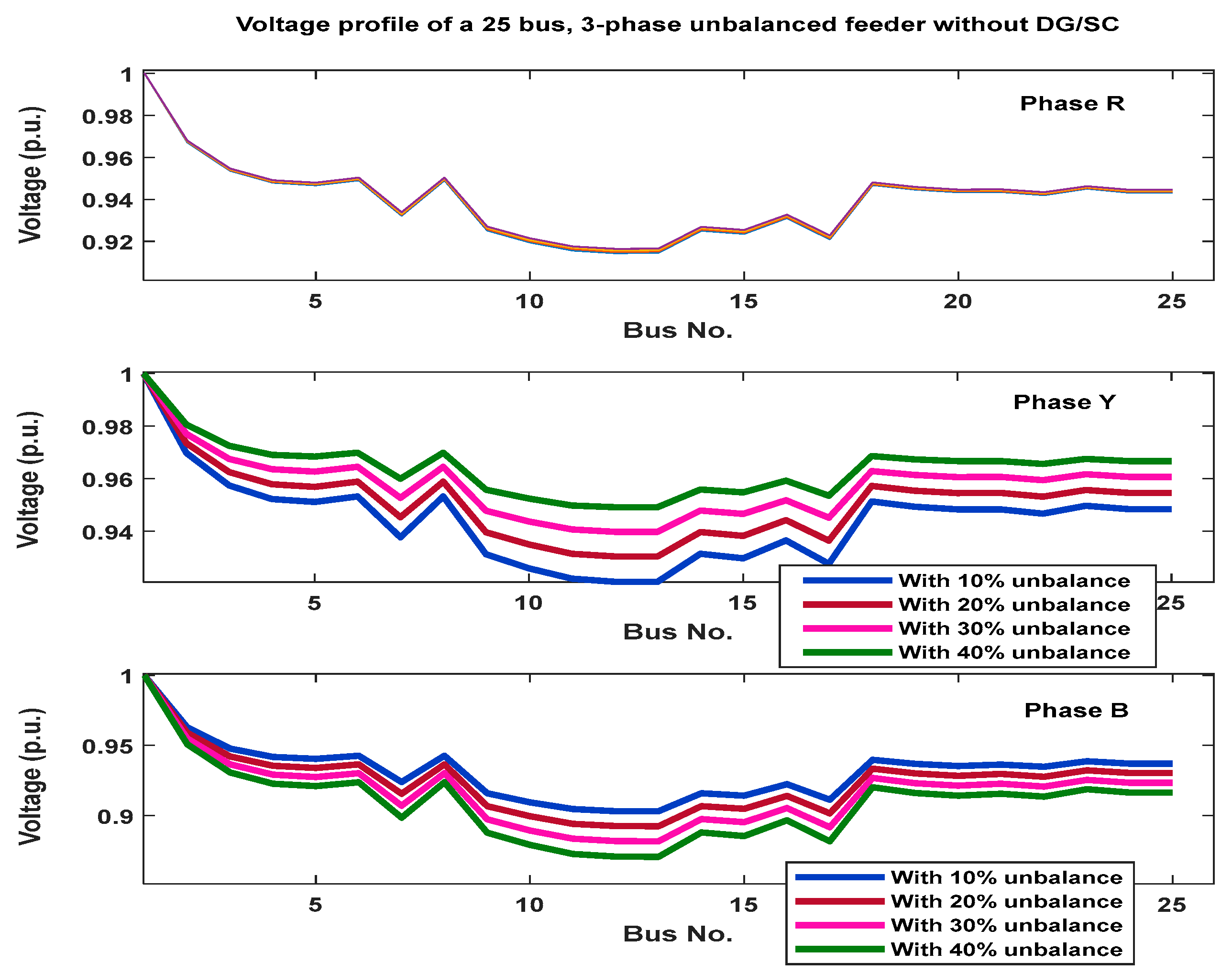 Table 3. It is noticed that the voltage unbalance factors are within the standard limits (i.e., <3%), but the current unbalance factor is increased to above the limit (i.e., <20%) in one of the cases as the load unbalance increases. The corresponding voltage profile of the 25-bus, 3-phase unbalanced feeder under various unbalance levels without DG/SC integration is shown in