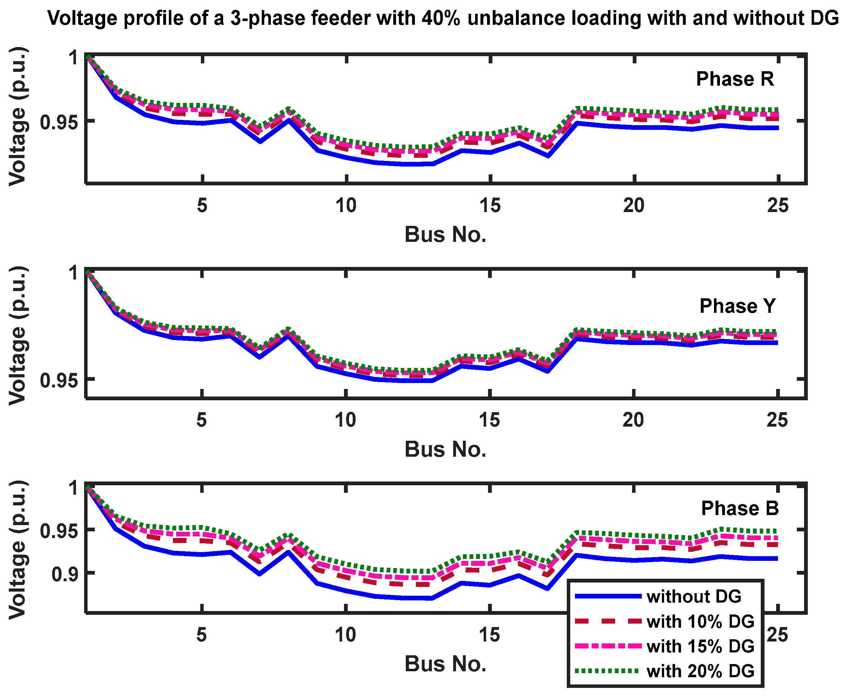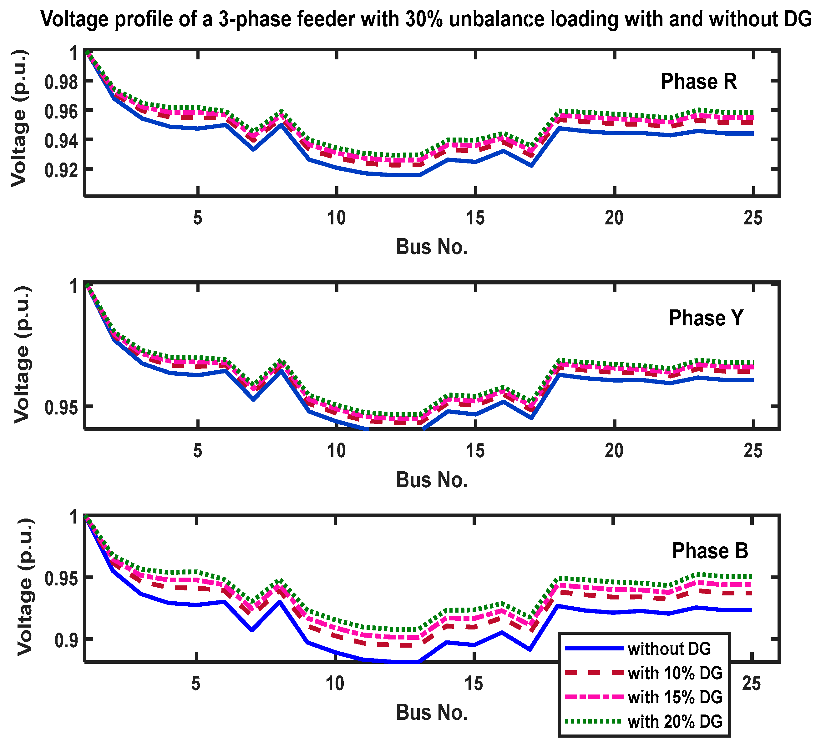 Voltage Profile Improvement: The voltage profiles of all three phases in the distribution system significantly improve by introducing DGs at different penetration levels. As a result, the system’s voltage levels are more consistent and closer to the intended nominal values.
