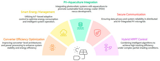 This Special Issue provides a holistic overview of the MPPT methods used for PV systems employed in microgrid environments, in terms of principles, comparative performance, and applicability within the framework of Industry 4.0 energy management. To provide a complete view of these interconnected developments, the conceptual framework of the development of microgrid PV systems is illustrated in Figure 1 illustrates five important research dimensions that jointly enable intelligent, secure and sustainable energy management.