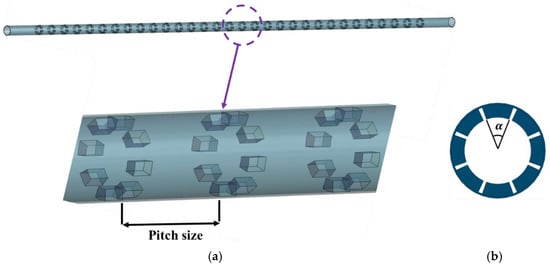Schematic representation of the absorber tube equipped with ASRT: (a) longitudinal arrangement and pitch distribution, (b) cross-sectional view showing the segmental angle (α).