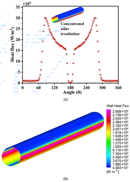 Circumferential distribution of solar heat flux on the absorber tube obtained by the MCRT method: (a) angular variation of solar heat flux and (b) three-dimensional contour of the non-uniform wall heat flux applied in Ansys Fluent through a UDF.