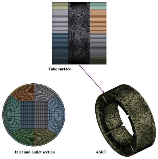 To ensure the model’s applicability under non-uniform wall heat-flux conditions, additional comparisons were performed using available experimental and numerical results from [14,28,32,33] involving tubes equipped with various internal inserts such as helically corrugated surfaces, spring turbulators, and toroidal rings. These studies demonstrate similar thermofluidic behaviors under circumferentially varying heat flux, supporting the consistency and reliability of the present CFD model. As illustrated in Figure 6a, the Nusselt numbers predicted for the smooth tube agree well with the Gnielinski correlation, whereas the ASRT configuration exhibits a noticeable increase in convective heat-transfer performance. Figure 6b shows that the predicted friction-factor values are consistent with both the Filonenko relation and published data, with deviations remaining below 6%, confirming the numerical stability and accuracy of the adopted mesh.
